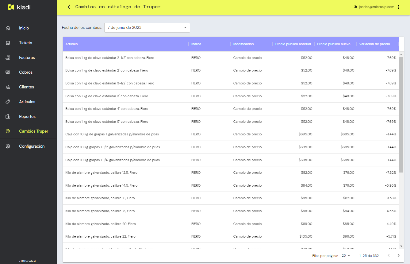 En la pantalla ‘Cambios Truper’ te notificaremos cuando se produzcan cambios de precio en el catálogo de artículos de Truper y podrás consultar el detalle de los cambios en la sección ‘Cambios Truper’.