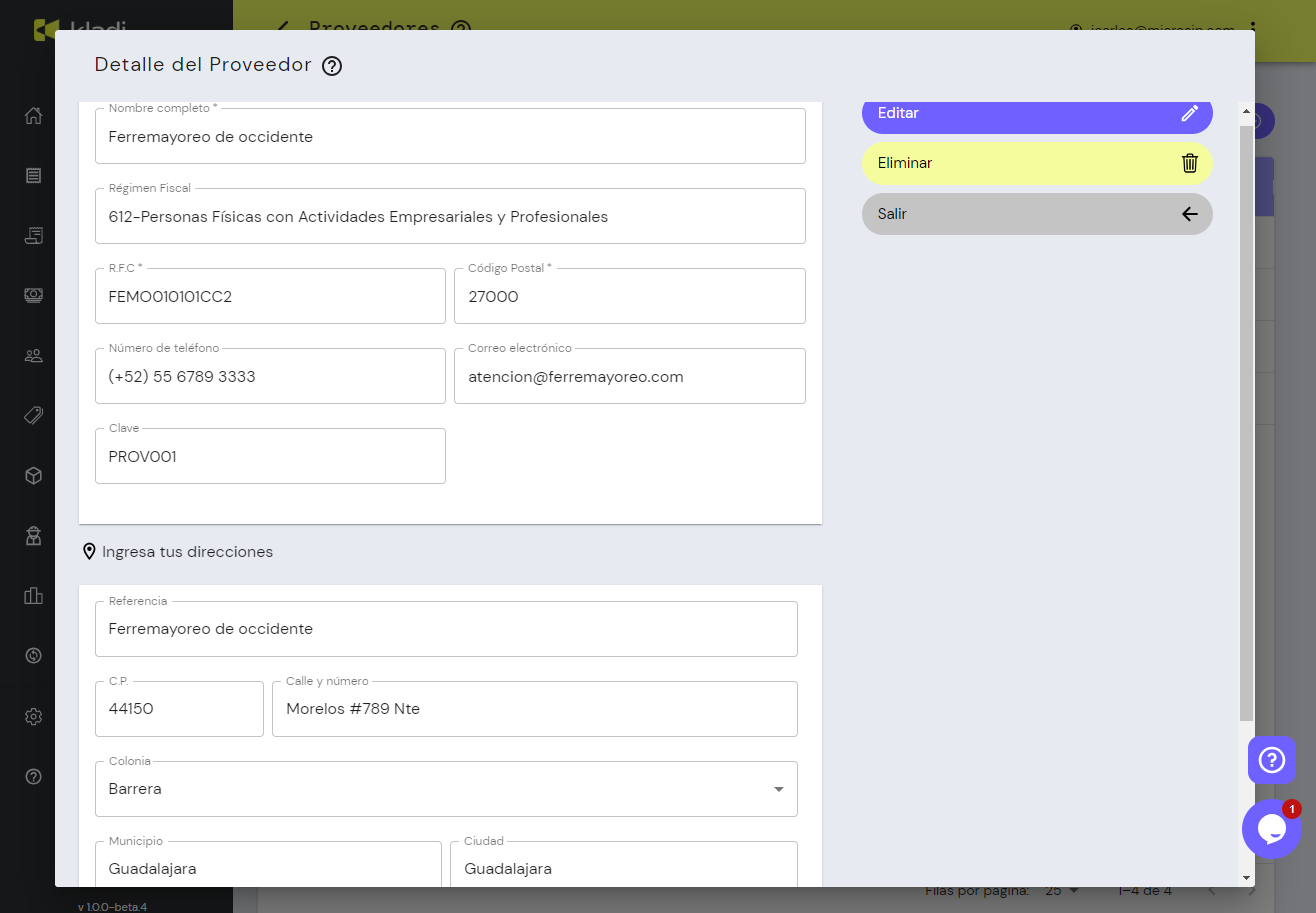 Desde el listado de proveedores se puede consultar el detalle de un proveedor haciendo click en la hiperliga de la columna ‘Nombre’.