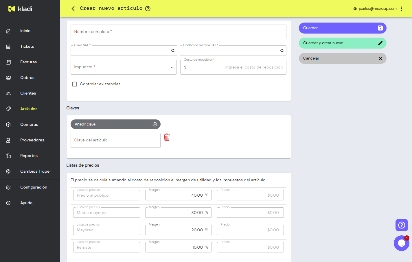 Selecciona la opción ‘Controlar existencias’ si deseas que Kladi lleve el control de las existencias del artículo.